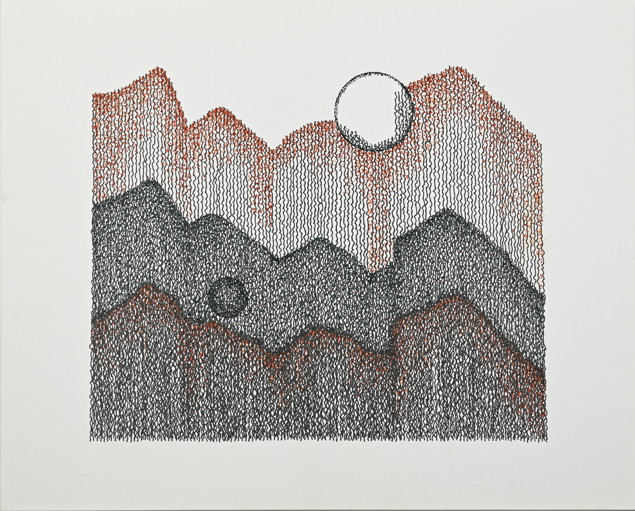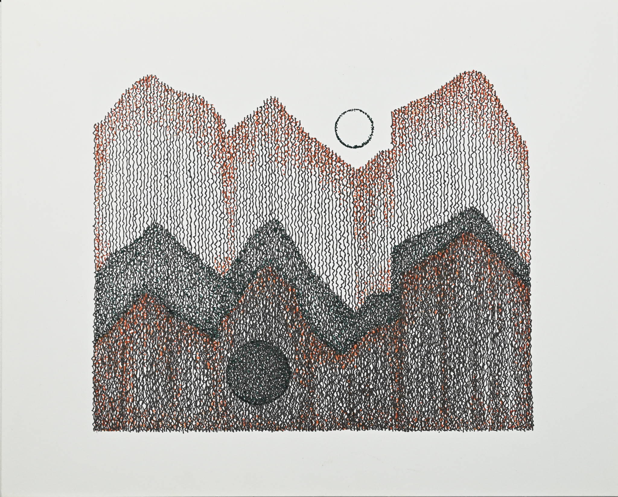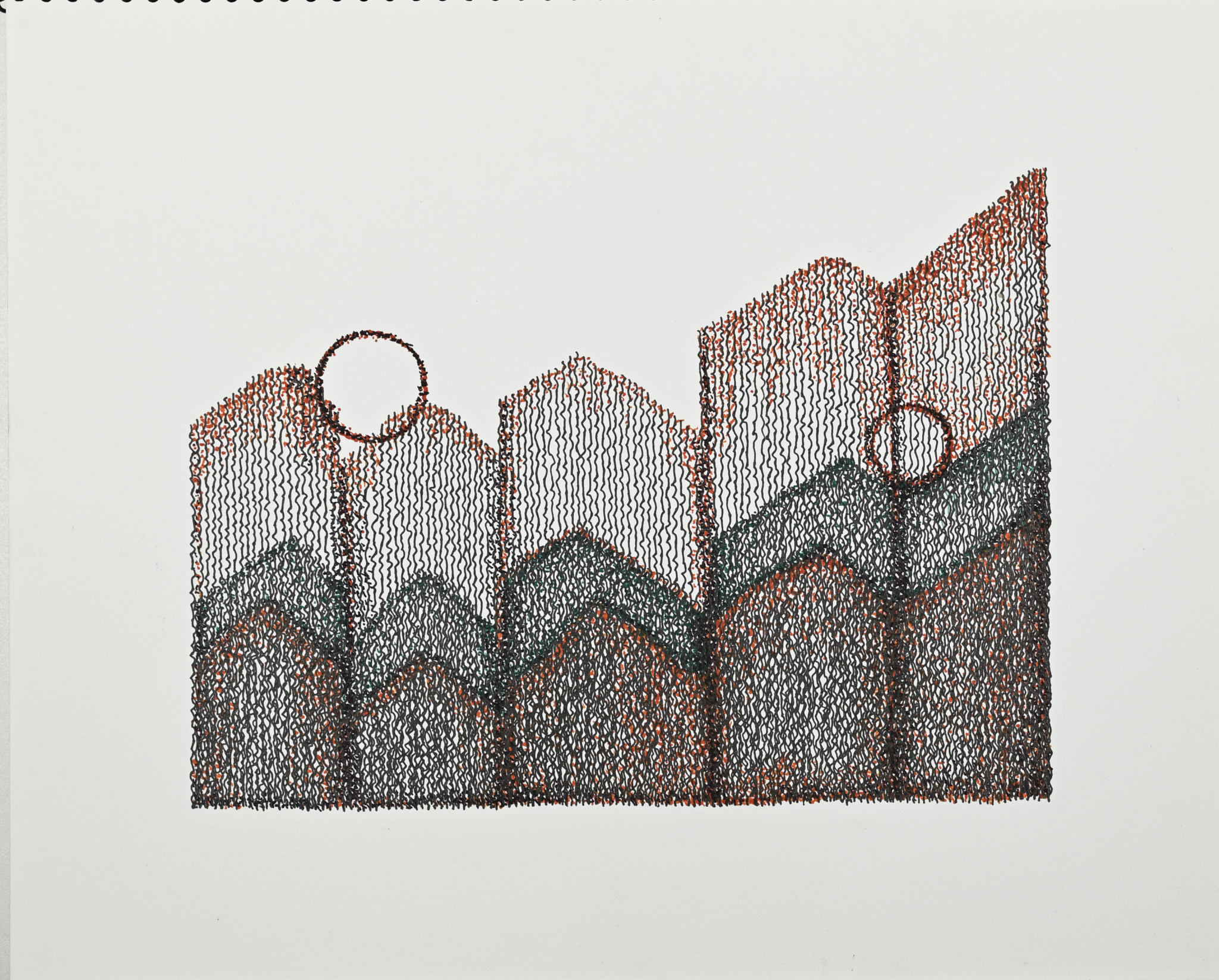 In the summer of 2024, my person and I took a trip from Oakland, California to Basalt, Colorado to visit with family. We had planned to spend a few days after family time visiting the Grand Canyon, but in the massive heat dome over much of the USA, our vehicle lost air conditioning. Getting it fixed led us to stop in Utah, and we ended up at a small RV park for a few days. The desert landscape is beautiful, and I began experimenting with combinations of green, orange-red, and black inks, using lines and stippling. The resulting drawings attempt to abstract and capture how spending unexpected time in such a different environment became an opportunity to explore new forms. (read more)