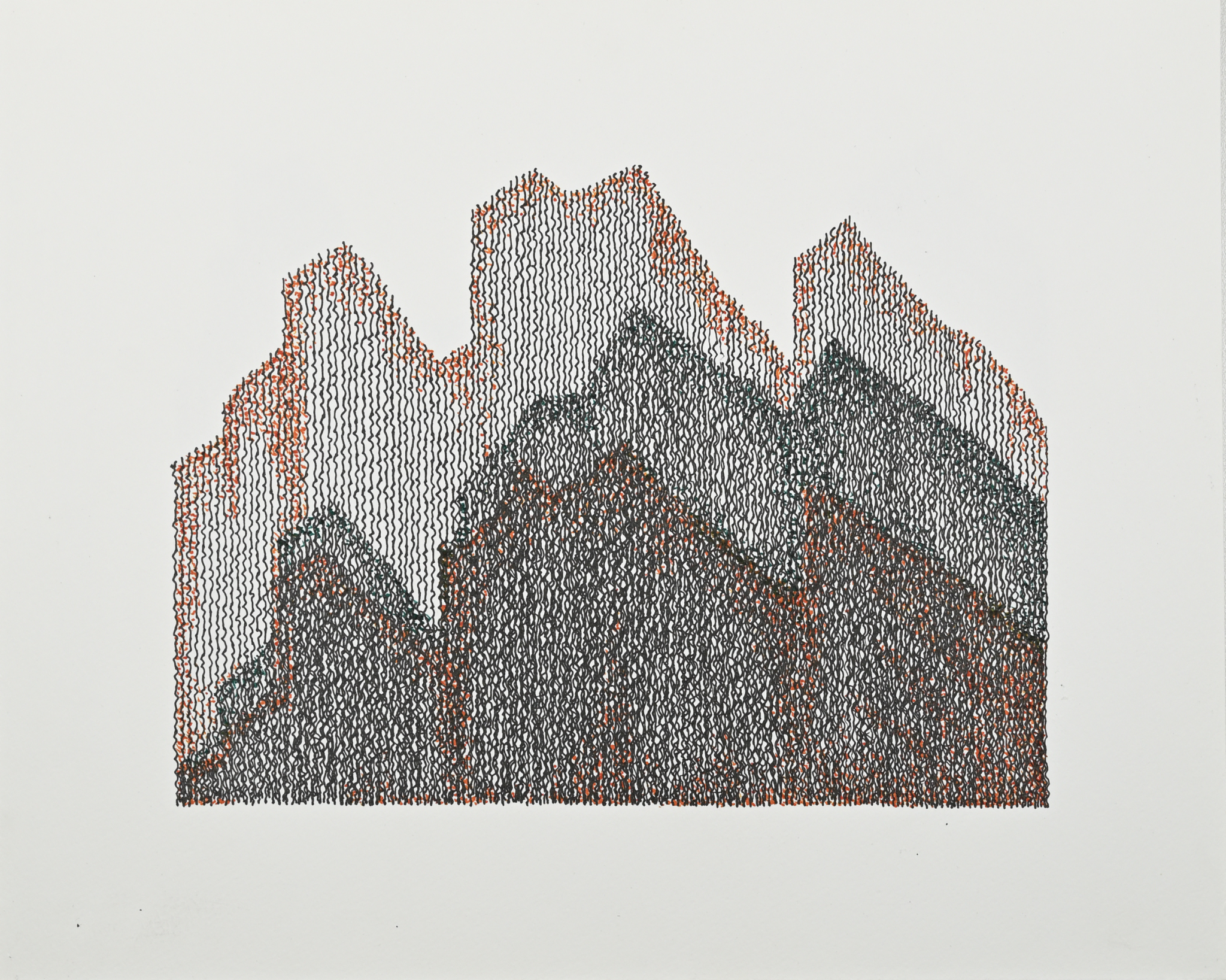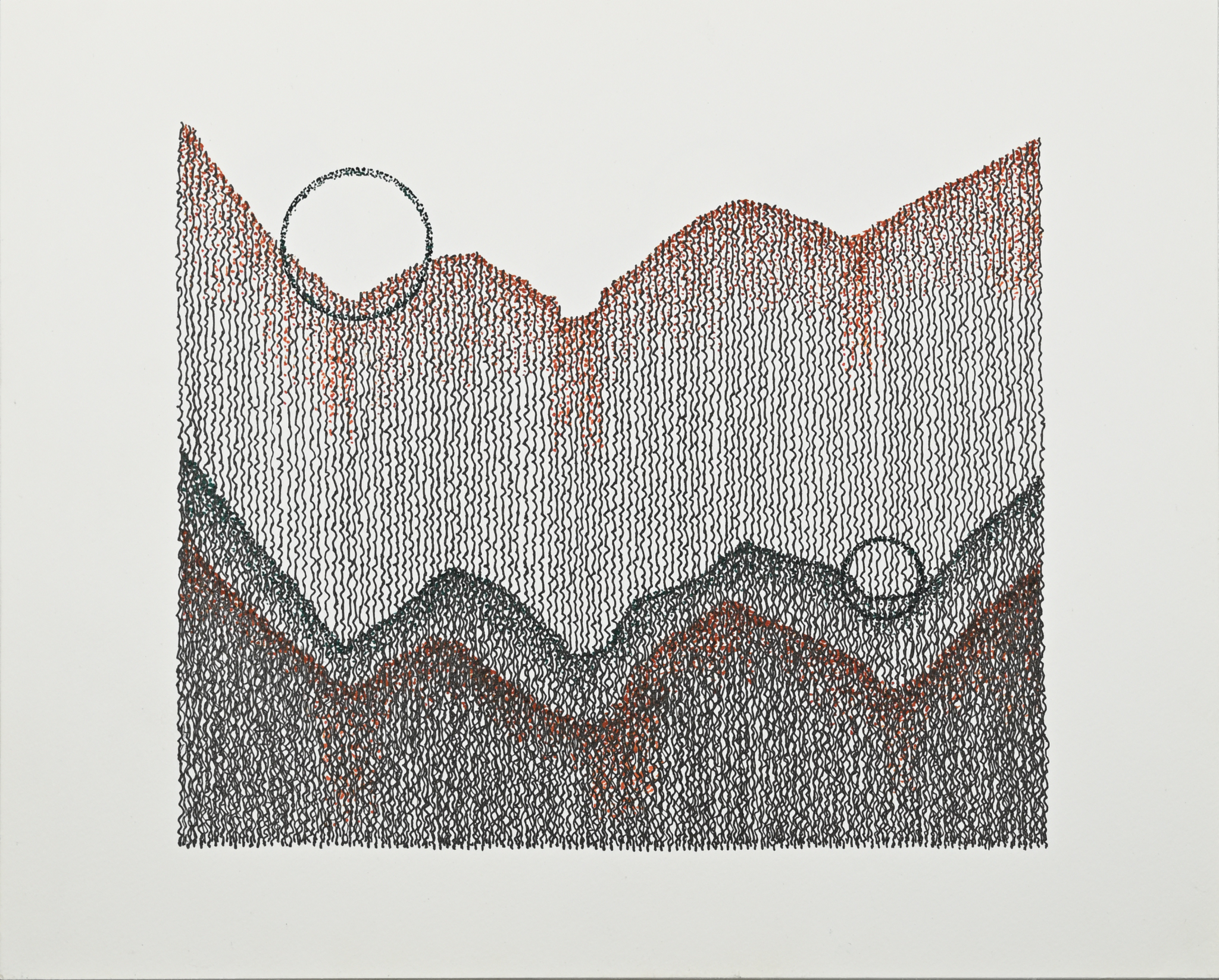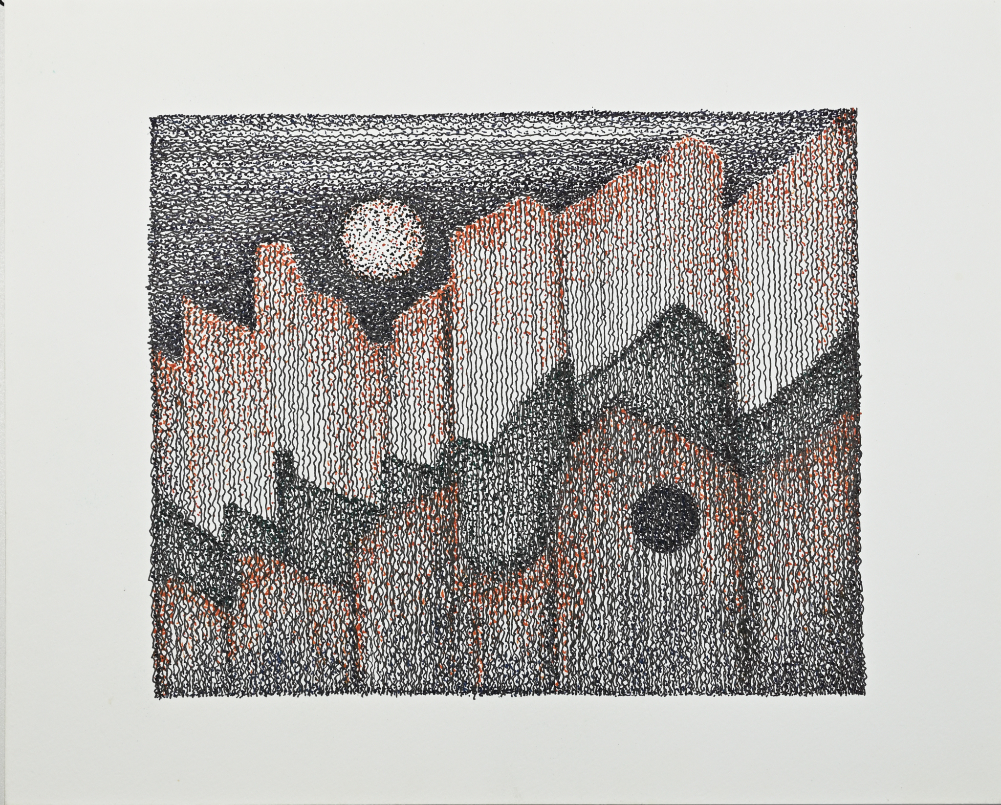 In the summer of 2024, my person and I took a trip from Oakland, California to Basalt, Colorado to visit with family. We had planned to spend a few days after family time visiting the Grand Canyon, but in the massive heat dome over much of the USA, our vehicle lost air conditioning. Getting it fixed led us to stop in Utah, and we ended up at a small RV park for a few days. The desert landscape is beautiful, and I began experimenting with combinations of green, orange-red, and black inks, using lines and stippling. The resulting drawings attempt to abstract and capture how spending unexpected time in such a different environment became an opportunity to explore new forms. (read more)